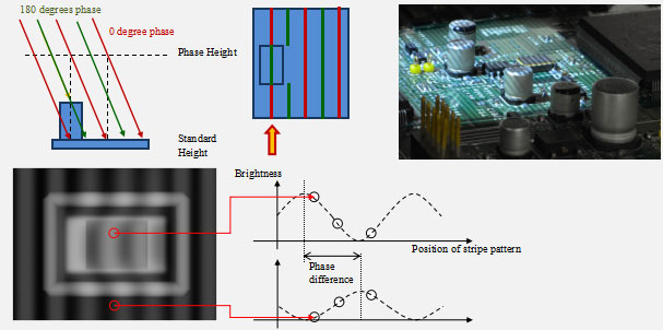 SAKI在線在線AOI自動光學(xué)檢測儀BF-3Di使用多組條紋光系統(tǒng).通過投射寬窄模式的黑白條紋光,可以穩(wěn)定地精確測量出各種類型元件的高度信息.例如:0402mm元件,黑色的IC本體,以及鏡面材質(zhì)的元件.