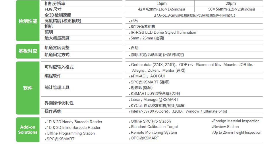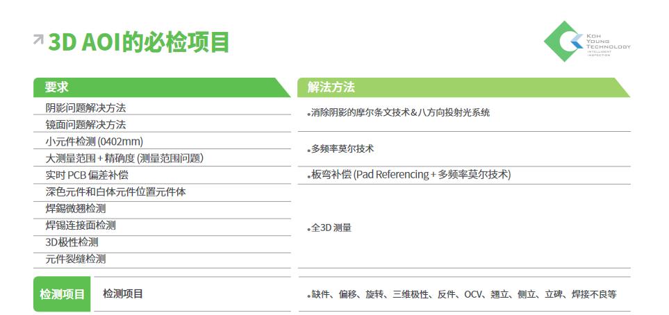 KOH YOUNG TECHNOLOGY Zenith UHS 高速全3D AOI,帶來 SMT 工藝管理的革命 行業(yè)領(lǐng)先的全三維測(cè)量檢測(cè)設(shè)備技術(shù)解決方案 - 業(yè)界唯一既符合 IPC-610 標(biāo)準(zhǔn)又具備直觀編程的檢測(cè)標(biāo)準(zhǔn)設(shè)置 - 通過基于測(cè)量的數(shù)據(jù)執(zhí)行缺陷診斷,并消除可能出現(xiàn)錯(cuò)誤的原因 - 完美的三維焊點(diǎn)檢測(cè) 基于全三維數(shù)據(jù)的工藝優(yōu)化解決方案:實(shí)現(xiàn)工業(yè) 4.0 /智能工廠 適用于各種生產(chǎn)環(huán)境的最佳規(guī)格典范