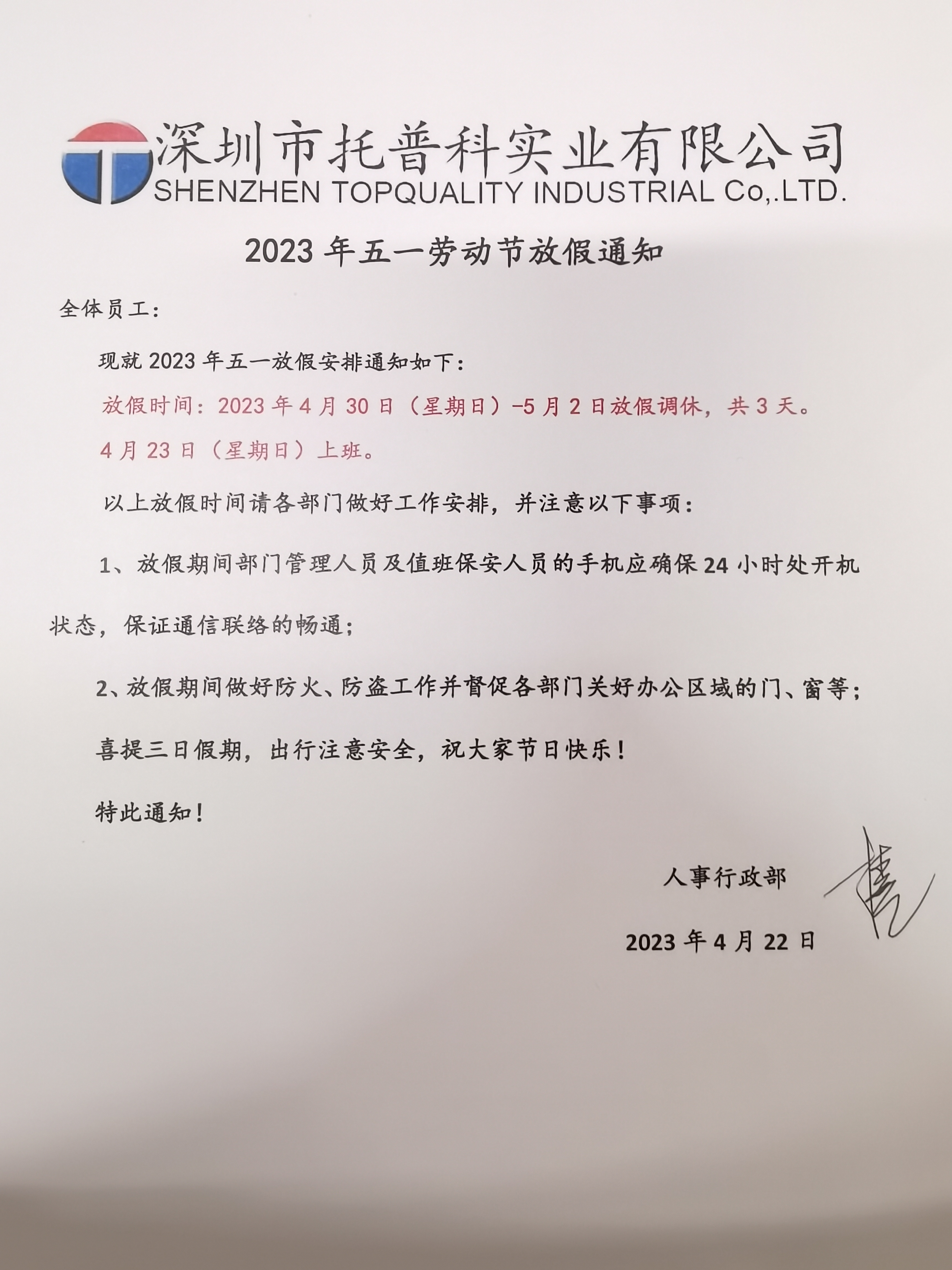 深圳托普科實(shí)業(yè)2023年五一放假通知