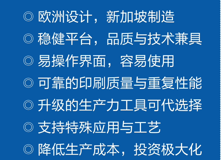 Eby DEK印刷機(jī),歐洲設(shè)計(jì),新加坡制造。穩(wěn)健平臺(tái),品質(zhì)與技術(shù)兼具,易操作界面和容易使用??煽康挠∷①|(zhì)量與重復(fù)性能。