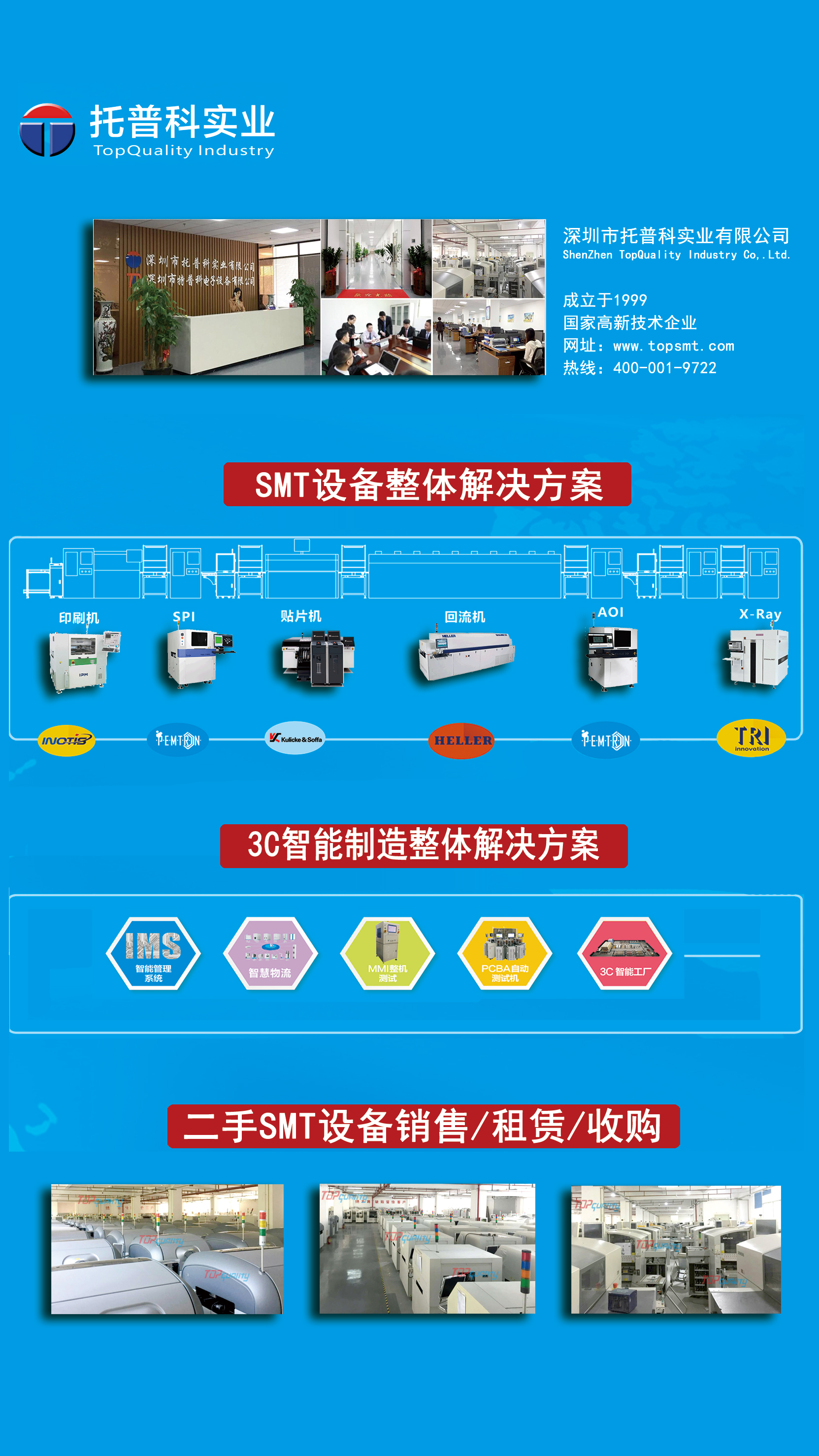 深圳市托普科實(shí)業(yè)有限公司是一家高科技術(shù)公司,專業(yè)提供二手及全新SMT設(shè)備,(貼片機(jī),回流焊,波峰焊,印刷機(jī),AOI,SPI)收銷/租賃/維修以及SMT周邊所有設(shè)備研發(fā)、生產(chǎn),銷售為一體,產(chǎn)品有:(上板機(jī)、下板機(jī)、接駁臺、平行移載機(jī)、雙軌機(jī)、跌板機(jī)、真空吸板機(jī)、緩存機(jī)、NG/OK收板機(jī)、印刷機(jī)、及各類工業(yè)控制系統(tǒng)開發(fā),配件銷售)提供一站式SMT貼裝解決方案。